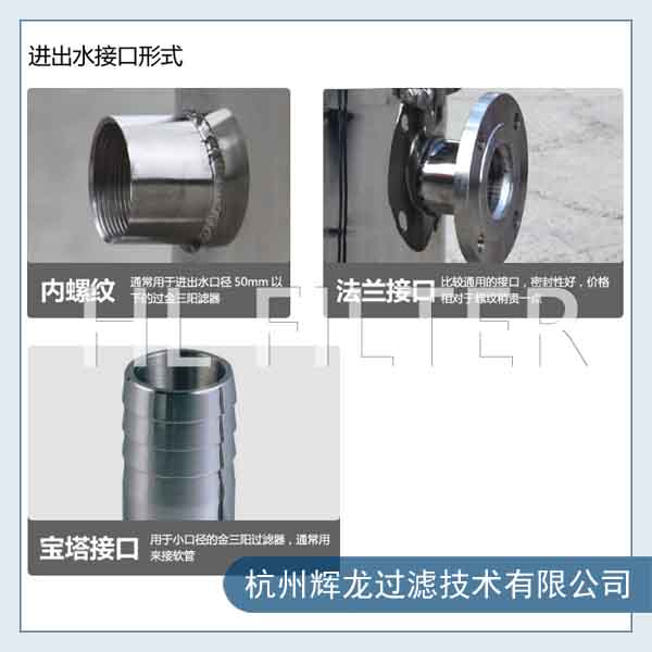 過濾器的連接主要由接頭形式決定。目前主要的連接方式有:法蘭連接、快裝、螺紋、寶塔皮管連接等