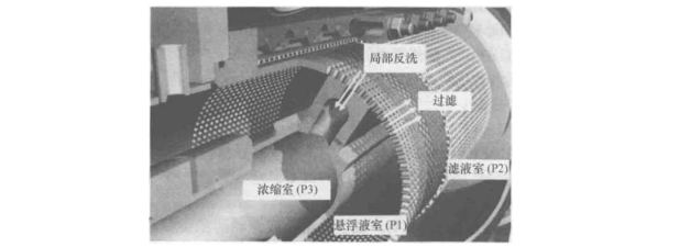 過濾介質可以是金屬纖維織物,也可是合成纖維織物,安裝在帶孔轉鼓的外表面上,由織物的內部或表面來截留不同尺寸的顆粒.