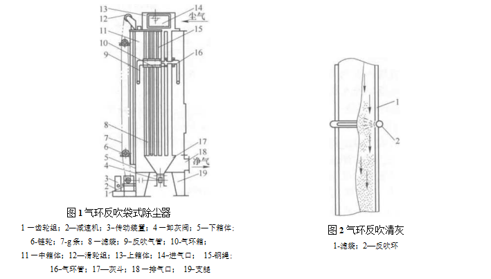 氣環反吹袋式除塵器濾袋清灰依靠氣環反吹裝置進行,該裝置的核心是氣環箱,箱內為每條濾袋配置一個鋁合金氣環套在濾袋外面.