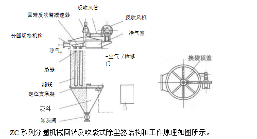 反吹風清灰裝置:包括回轉反吹臂,反吹口,分圈切換機構,循環風管,反吹風管,反吹風機,減速器.