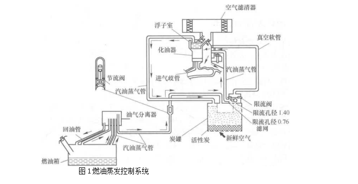 經油箱和化油器蒸發的HC占HC排放總量的20%.燃油蒸發控制系統將汽油蒸氣收集和儲存在炭罐內.在發動機工作工作時再將其送入汽缸燃燒.