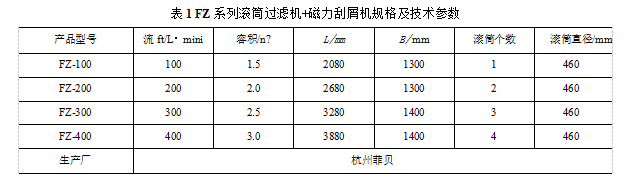 FZ系列滾筒過濾機+磁力刮屑機規格及技術參數見表1