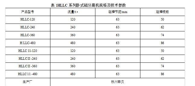 HLLC系列臥式磁分離機規格及技術參數見表1
