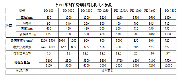 SD/PD系列吊袋上部卸料離心機技術參數見表