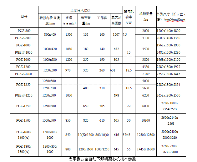 PGZ系列平板離心機是一種全自動控制的立式刮刀卸料離心機,在電氣控制下,轉鼓啟動達到進料速度后,控制系統(tǒng)打開進料閥,被處理懸浮液從進料管進入轉鼓。在轉鼓高速旋轉產生的強大離心力作用下,進入轉鼓內的懸浮液被均布于轉鼓內壁的過濾介質上,成空心圓柱狀。液相通過過濾介質和轉鼓上的許多小孔被甩出轉鼓外,由機殼內壁和底盤收集,從岀液管排出,而固相粒子則被留在過濾介質上。當進料量達到設定值,由料層控制器(或進料時間)向控制系統(tǒng)發(fā)出信號,關閉進料閥門。同時,根據工藝需要可對物料進行洗滌,洗滌達到要求后,在脫水速度下進行二次脫水。處理物料達到分離要求,控制系統(tǒng)控制主電機將回轉體的轉速降到卸料速度,卸料機構釆用窄刮刀,先由旋轉缸驅動徑向刮料,到位后停留一下,再軸向行程卸料,下降到位刮下轉鼓壁上的物料。固體顆粒通過刮刀卸料,借助重力經轉鼓底的卸料口從機座底部排出。 機器完成一個工作循環(huán),在控制系統(tǒng)(PLC)的控制下進入到下一個工作循環(huán)。