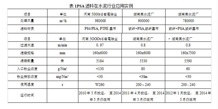 現(xiàn)已批量生產(chǎn)包括細(xì)旦芳硯綸纖維在內(nèi)的纖維和濾料產(chǎn)品,并用于水泥窯尾煙氣除塵 和鋼鐵行業(yè),獲得良好效果。表1為PSA復(fù)合濾料用于水泥窯煙氣除塵的情況。