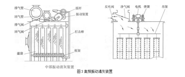 中部振動清灰裝置也屬于橫向振動,由電機、曲柄和連桿等組成(圖3),同樣要求袋式除塵器設計成若干個獨立的倉室,清灰逐室進行,通常與反吹清灰方式結合使用。清灰時,電機通過搖桿和打擊棒使框架橫向振動, 濾袋也隨之振動,濾袋上的粉塵隨之脫落;同時,倉室的排氣閥和回氣閥切換,干凈氣流從回氣閥門及向進入濾袋,促進濾袋清灰。有的清灰裝置還裝有電加熱器對清灰氣流加熱,在含塵氣體濕度較高的條件下,避免溫度較低的清灰氣流導致除塵器內結露。